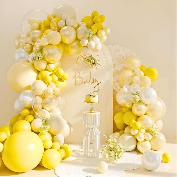 Gender-Neutral Baby Welcome Decoration For families who kept the gender a surprise, or simply prefer a non-gendered aesthetic, neutral palettes — white, ivory, gold, sage green, or soft yellow — work beautifully. Our Baby Bloom Bash Decoration and Yellow Vibes setup are designed exactly for this preference.