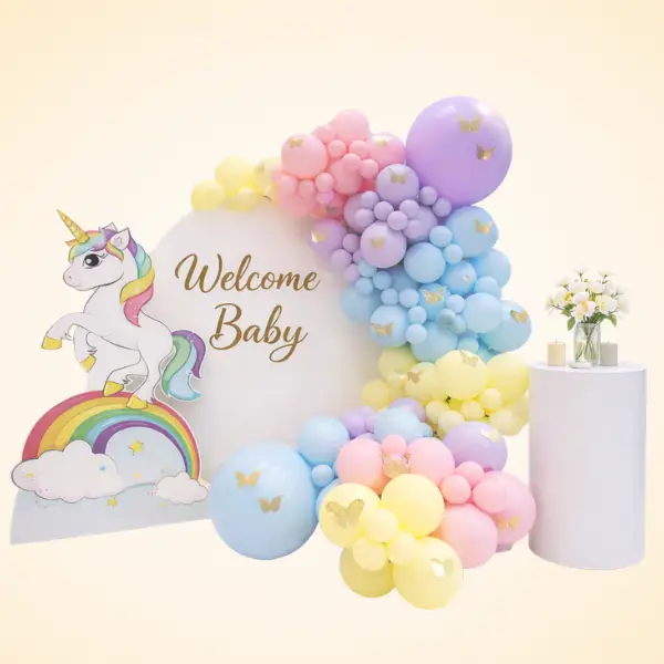 Kids birthday balloon decoration (ages 1–10) Character colour palettes, themed elements, large number foils, and cheerful primary or pastel combinations. Our most-booked kids' birthday setups include the Simple Balloon Arch Decor and Trendy Party Decor for Birthday — both structured enough to look professional, simple enough not to overwhelm a smaller child's space.