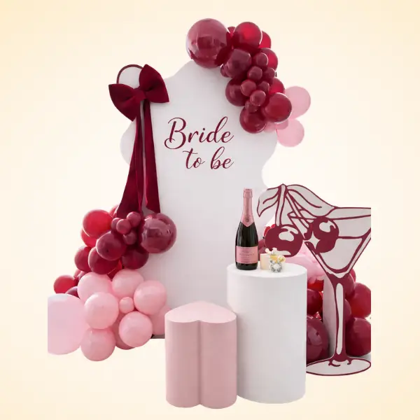 Balloon arches — freestanding organic arches, geometric frames, or wall-mounted garlands built from layered balloon clusters in coordinated colour palettes. These are the structural centrepiece of most setups.